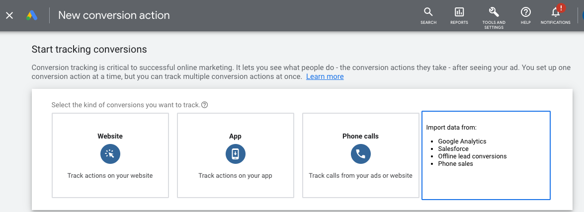 Then inside Google Ads, you can go to Tools and Settings -> Measurement -> Conversions, click New, and you can import your Google Analytics conversion here as the fourth option: