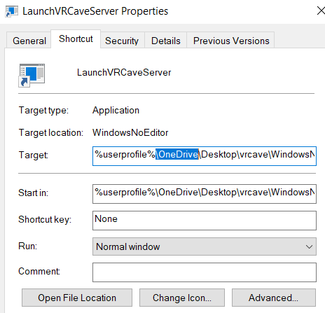Add OneDrive to your vrcave shortcuts, right click on the shortcut you are using and choose properties, add \OneDrive to the Target path and Start in line between userprofile and Desktop as shown below