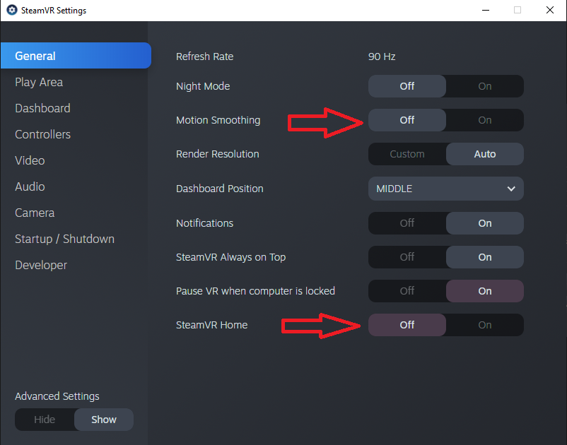 When SteamVR is finished you will want to disable SteamVR dashboard, the dashboard can block players view if they accidentally open it. Go to steamVR->Settings->General, click SHOW under Advanced Settings and turn off SteamVR Home and Motion Smoothing. Go to Dashboard tab Set VR Dashboard on System Button to Off.