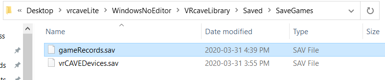 Go to your vrcave folder and follow this path: vrcave\WindowsNoEditor\VRcaveLibrary\Saved\SaveGames For vrcaveLite: vrcave\WindowsNoEditor\VRcaveLibrary\Saved\SaveGames
