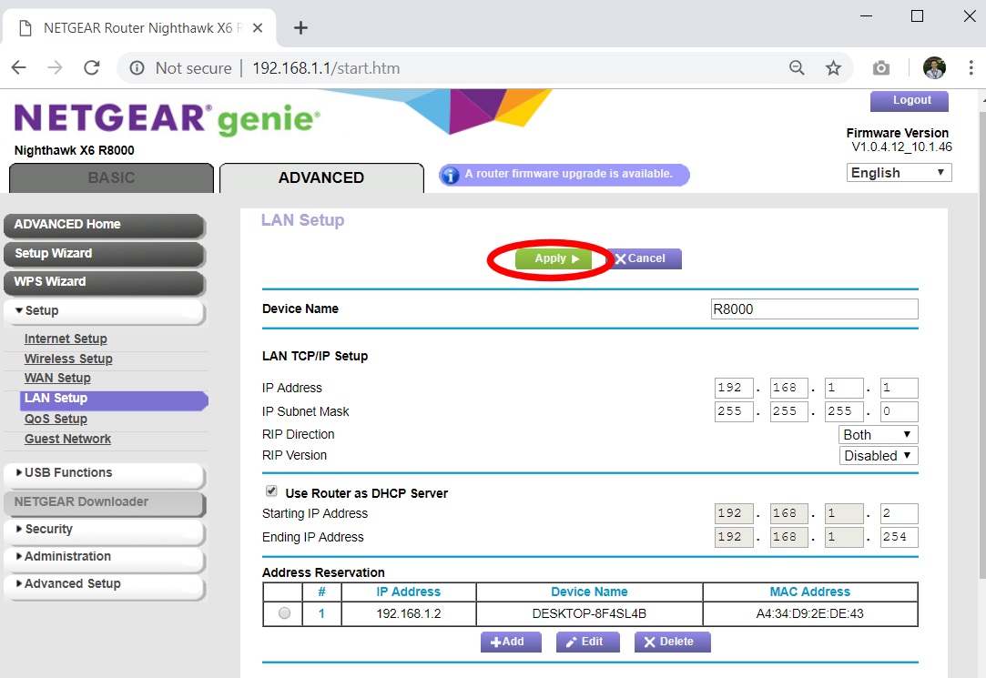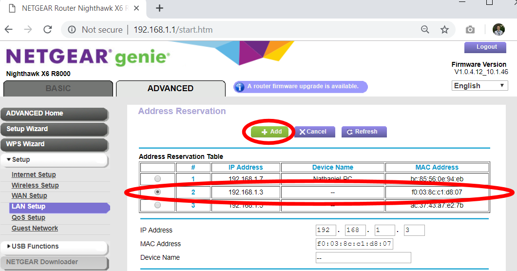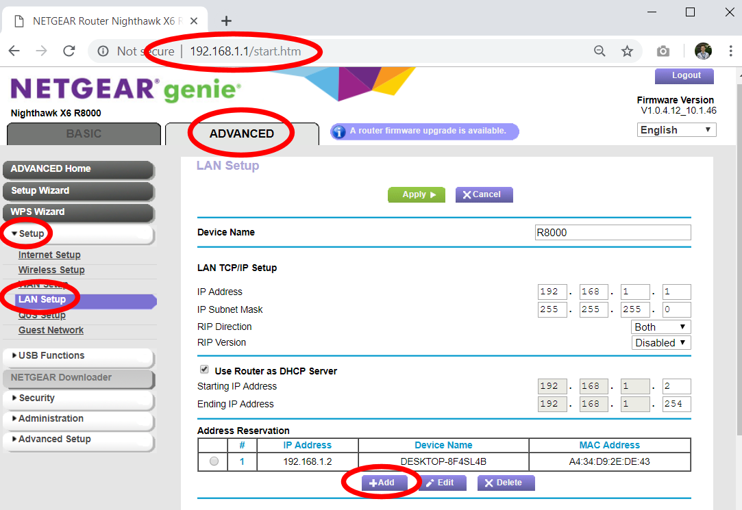 - On the Router Configuration page, go to the ADVANCED tab -> Setup -> LAN Setup to get to the LAN Setup Page. Click on the +Add button on the bottom of this page.