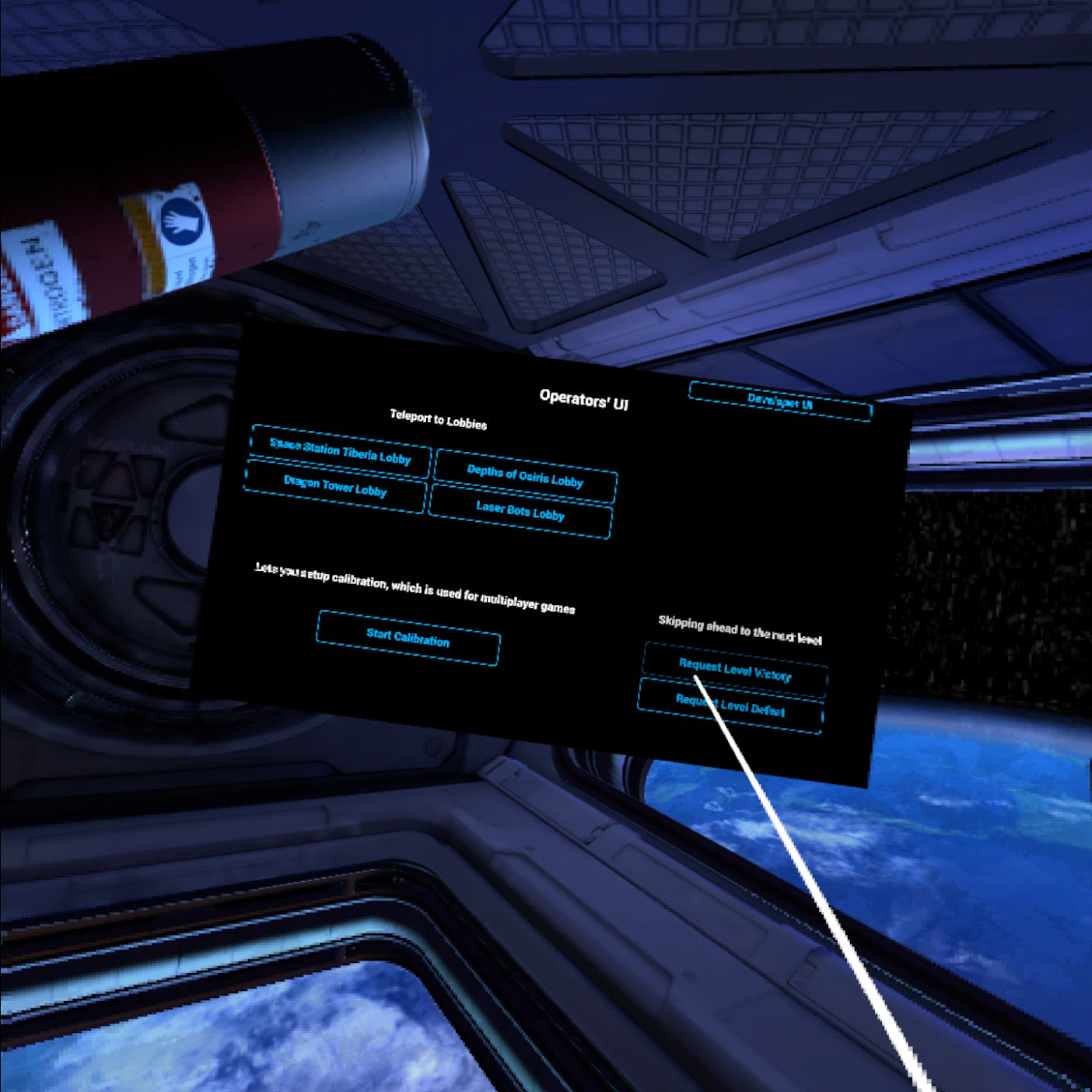 - Again, try solving the puzzles, or press Left_Trackpad_Click and click on Request Level Victory (or try Request Level Failure to see the bad ending). You’ll be taken back to the lobby level.